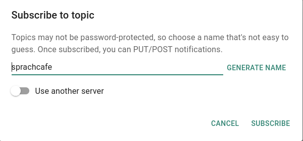 Der Kanal läßt sich auch über die Herstellerseite ntfy.sh abonnieren. Auch hier wählt man Thema abonnieren. Bevor man das Thema "sprachcafe" eingibt, muss man als Server "pad.hwn.de" einstellen.
